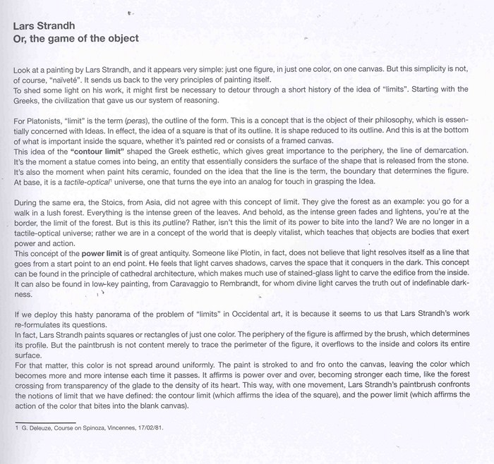 PRÉSENTATION DE L’OEUVRE DE LARS STRANDH, CATALOGUE OSLO (TEXTE EN ANGLAIS)