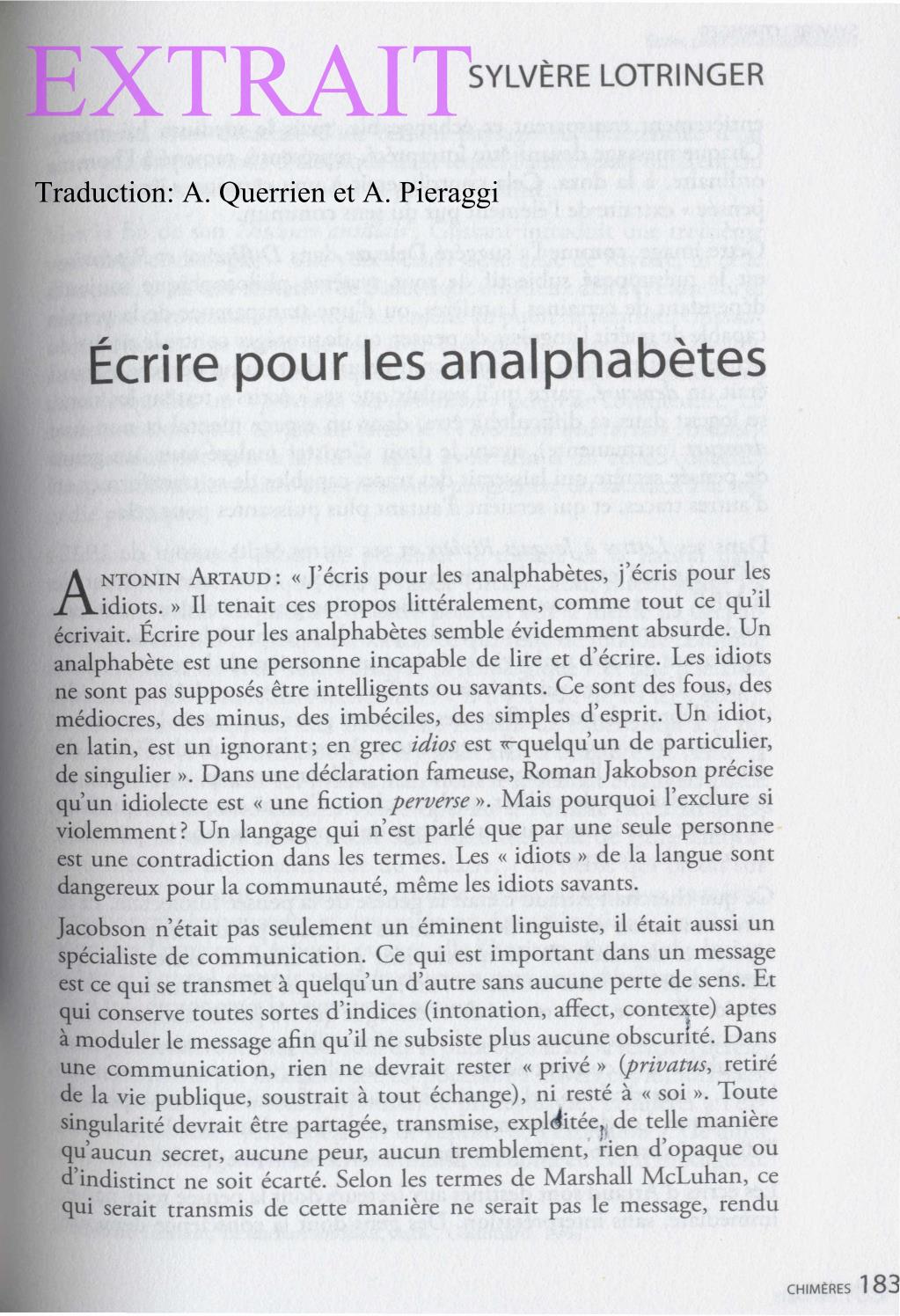 TRADUCTION AVEC A. QUERRIEN (S. LOTRINGER, « J’ÉCRIS POUR LES ANALPHABÈTES », CHIMÈRES N°90 : « AVEC E. GLISSANT »)