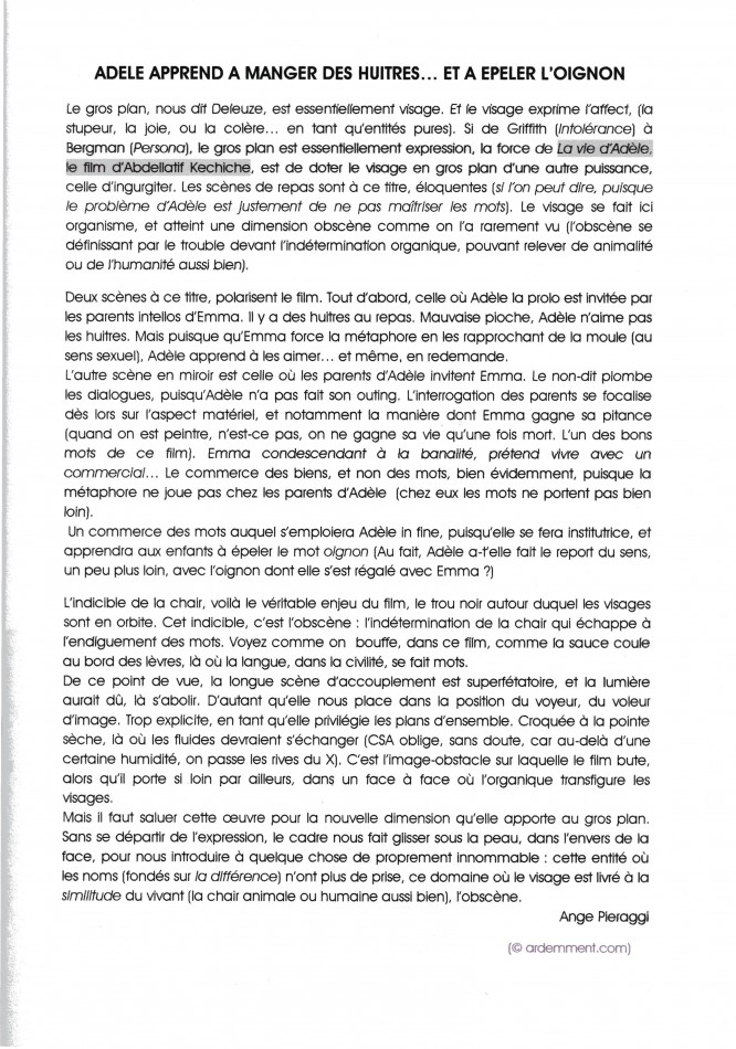 2013 ADÈLE APPREND À MANGER DE HUÎTRES… ET À ÉPELER L’OIGNON (SUR « LA VIE D’ADÈLE » D’A. KÉCHICHE) (ARDEMMENT.COM) DATE 07/05/2021 by Ange Pieraggi Ange Pieraggi